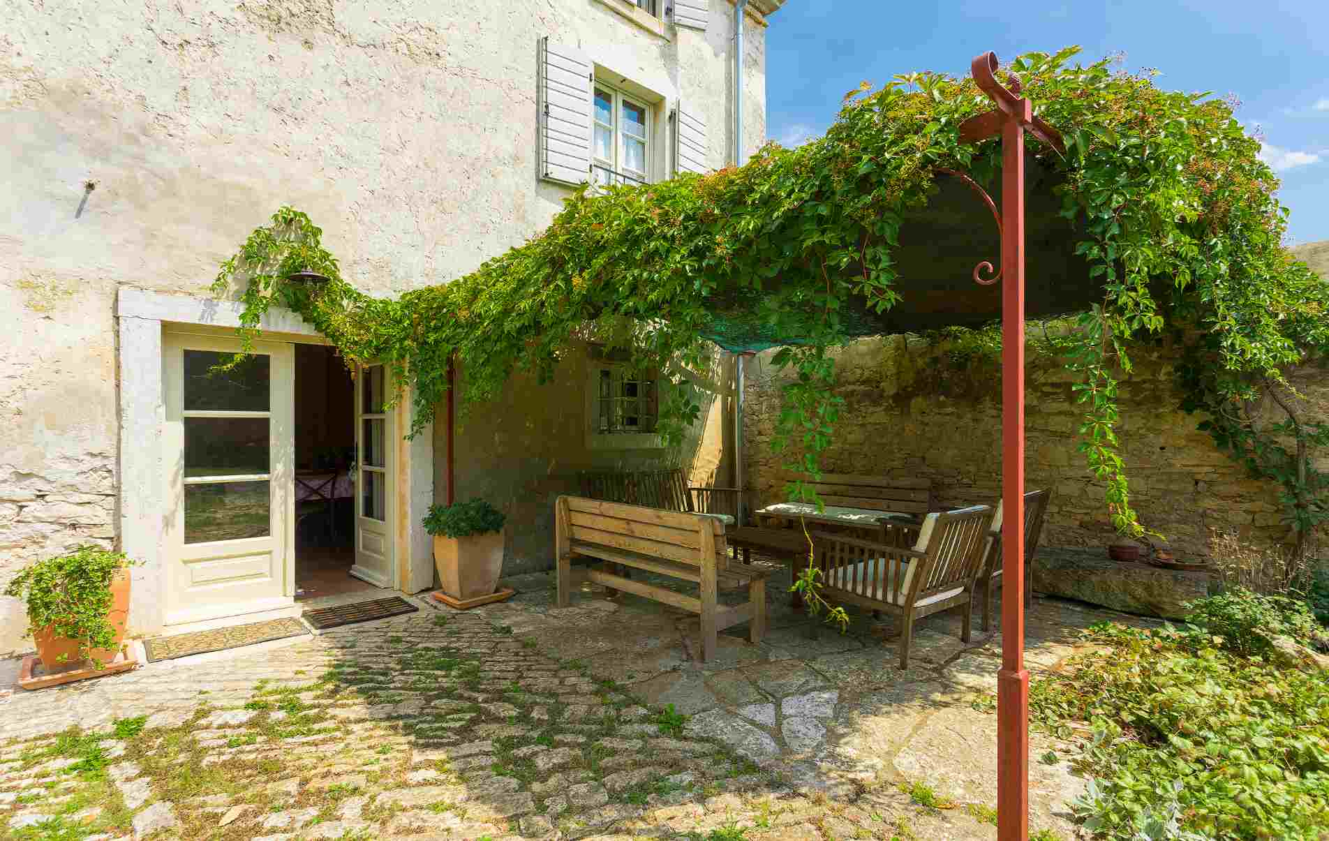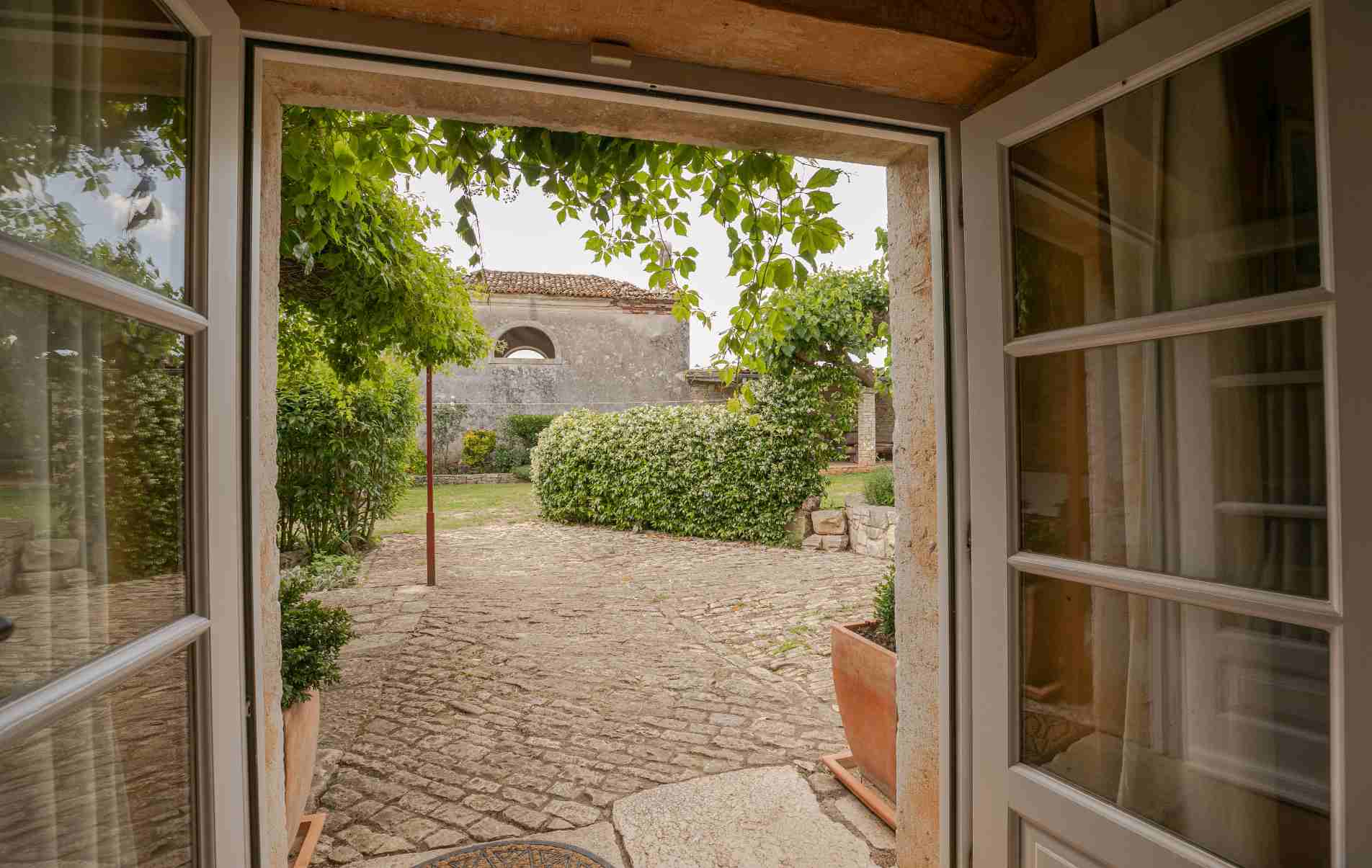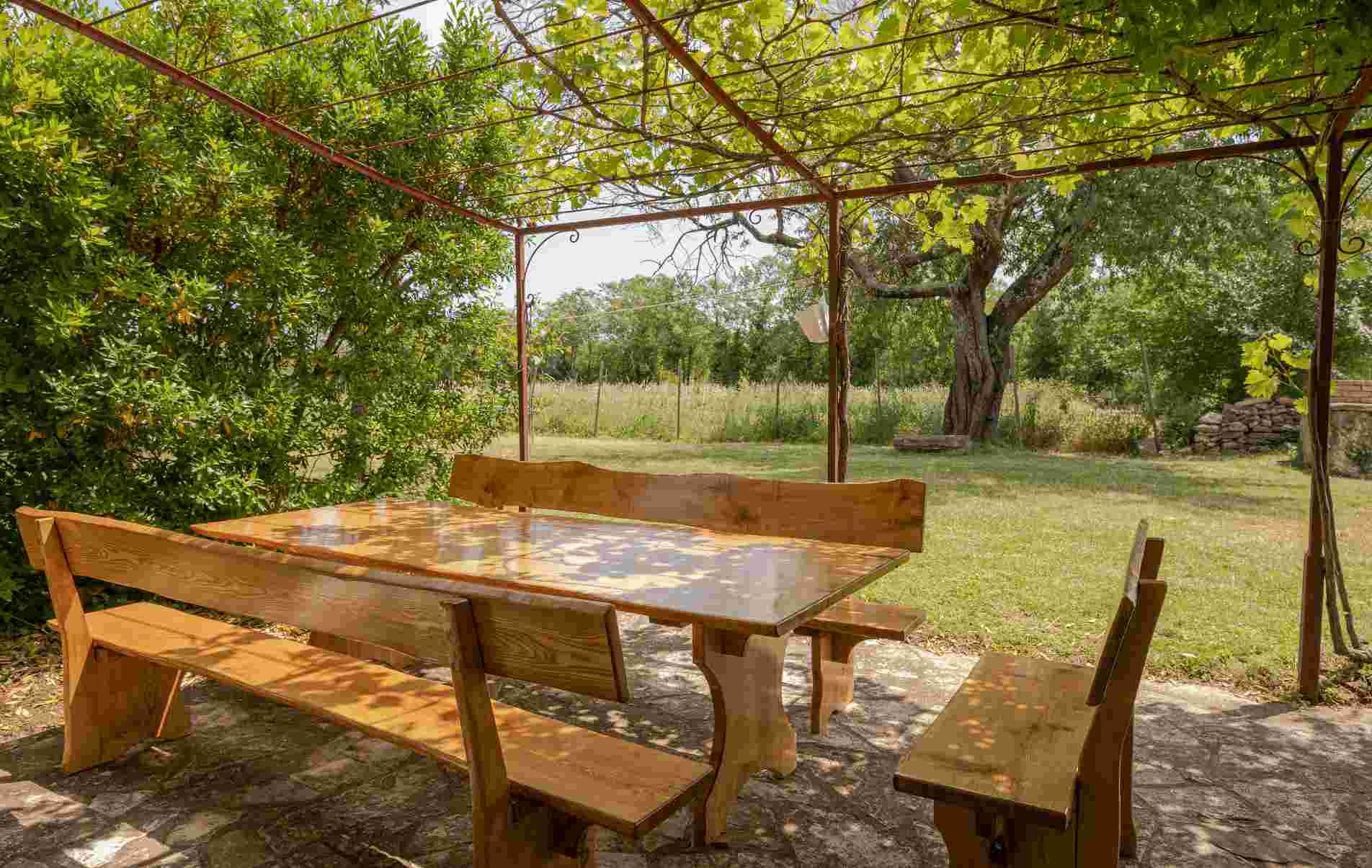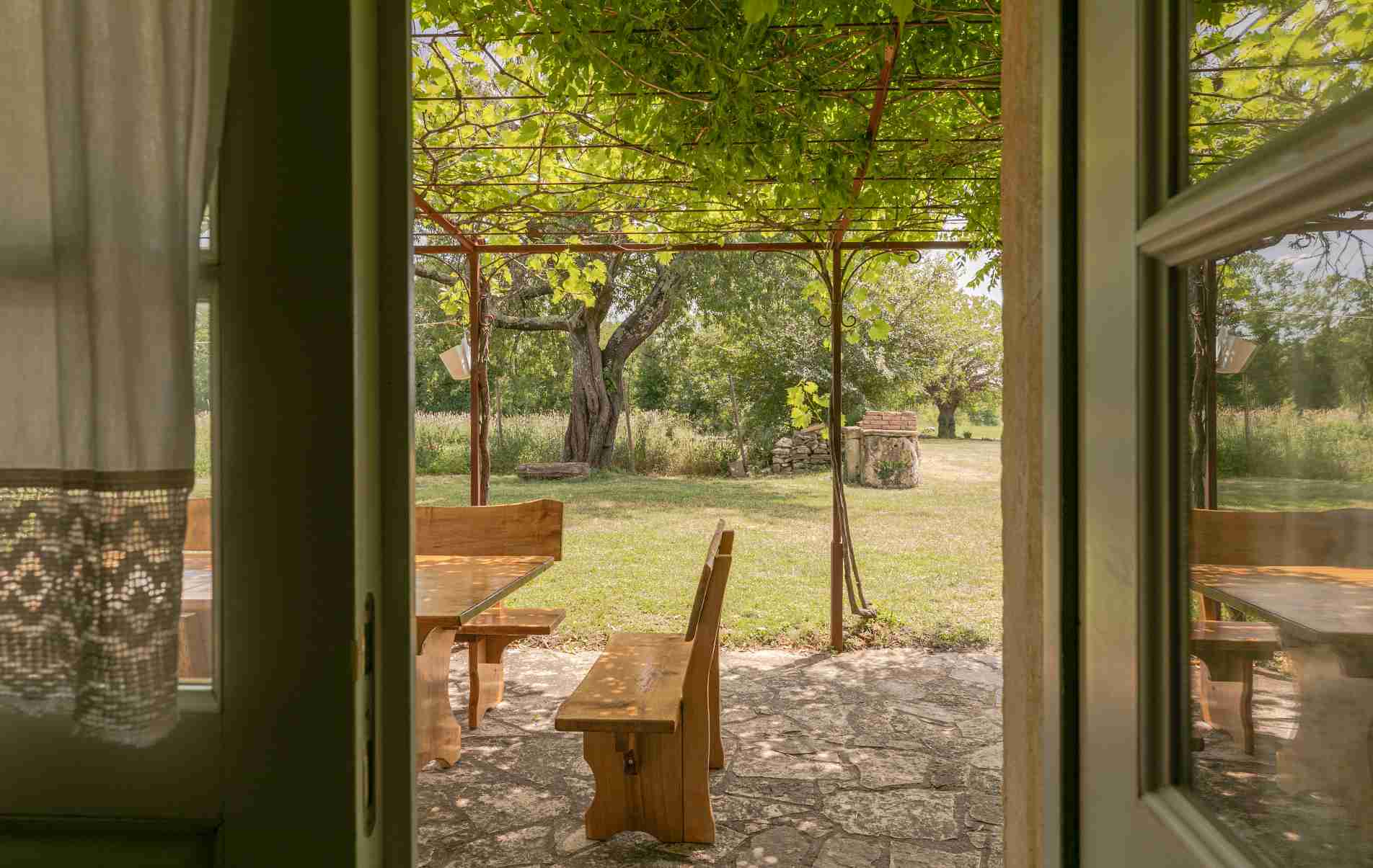 Iz prizemnog dnevnog boravka i kuhinje kuće Ita izlazi se kroz staklena vrata na kamenom popločano dvorište, obraslo zelenilom i okrenuto prema maloj crkvici u dvorištu. Ovdje jutra počinju kavom u hladu vinove loze, a večeri završavaju u miru, uz pogled na osvijetljenu crkvicu i tišinu istarske noći.